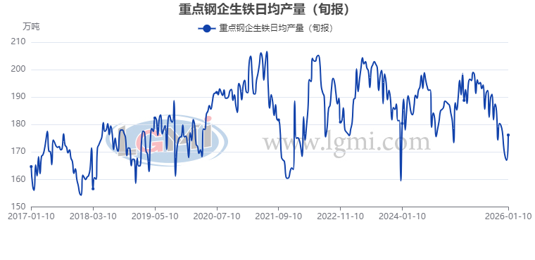 從重點(diǎn)大中型鋼鐵企業(yè)旬產(chǎn)數(shù)據(jù)來(lái)看,大中型鋼鐵生產(chǎn)企業(yè)的產(chǎn)能釋放力度明顯增強(qiáng)。據(jù)中國(guó)鋼鐵工業(yè)協(xié)會(huì)統(tǒng)計(jì)數(shù)據(jù)顯示,2026年1月上旬重點(diǎn)鋼企生鐵日均產(chǎn)量176.2萬(wàn)噸,旬環(huán)比上升5.5%,同比下降6.2%(詳見(jiàn)圖3);1月上旬重點(diǎn)鋼企粗鋼日均產(chǎn)量199.7萬(wàn)噸,旬環(huán)比上升21.6%,同比下降3.3%(詳見(jiàn)圖4);1月上旬重點(diǎn)鋼企鋼材日均產(chǎn)量182.2萬(wàn)噸,旬環(huán)比下降3.7%,同比下降4.0%(詳見(jiàn)圖5)。