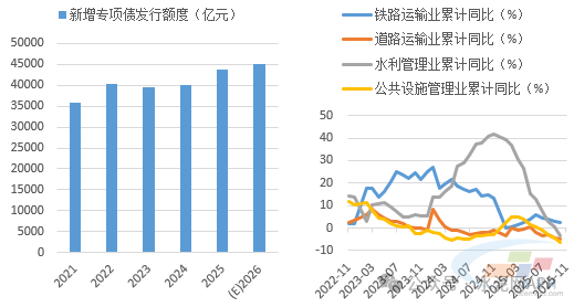 基建方面,我們判斷2026年投資將回正,基建端水泥需求將有改善。“十五五”規(guī)劃建議指出,加強謀劃論證,實施一批重大標志性工程項目,高質(zhì)量推進國家重大戰(zhàn)略實施和重點領域安全能力項目建設。2026年作為“十五五”開局之年,預計專項債、超長期特別國債發(fā)行規(guī)模將出現(xiàn)提高,基建投資將出現(xiàn)回正,但在化債政策影響下,水泥需求關系密切的交通類和市政基建投資或?qū)⒀永m(xù)低迷態(tài)勢,預計基建整體對水泥需求支撐將有所改善,但力度可能仍然不強。