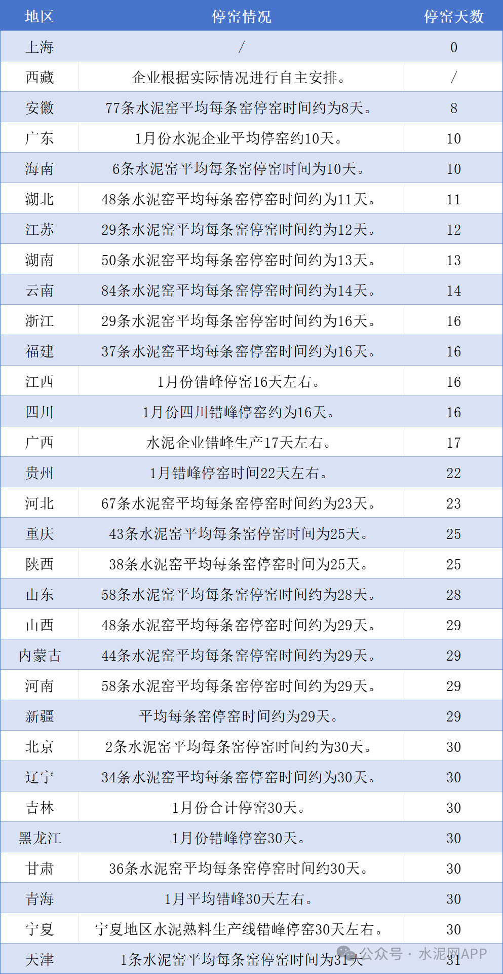 1月31省市水泥企業(yè)停窯情況統(tǒng)計