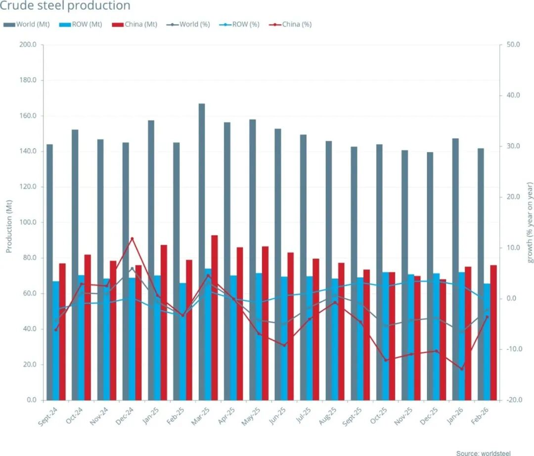 2026年2月全球69個納入世界鋼鐵協(xié)會統(tǒng)計國家/地區(qū)的粗鋼產(chǎn)量為1.418億噸,同比下降2.2%。