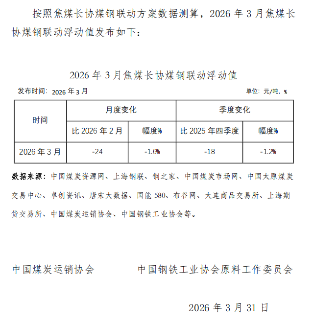 3月焦煤長(zhǎng)協(xié)煤鋼聯(lián)動(dòng)浮動(dòng)值