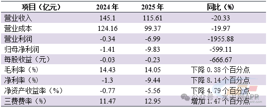 其他指標(biāo)方面悉數(shù)轉(zhuǎn)差。全年綜合毛利率錄得14.05%,比2024年同期下降0.38個(gè)百分點(diǎn);凈資產(chǎn)收益率-5.56%,較同期下降4.79個(gè)百分點(diǎn)。由于營(yíng)業(yè)收入降幅較大,公司三費(fèi)費(fèi)率小幅增加1.47個(gè)百分點(diǎn)至12.95%。