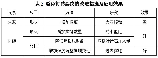 通過分析襯磚損毀機(jī)理,采取相應(yīng)改進(jìn)措施,見表2,并進(jìn)行相應(yīng)的應(yīng)用效果評(píng)估。通過改進(jìn)火泥及耐火磚參數(shù)來降低襯磚服役過程中產(chǎn)生的應(yīng)力集中度??梢钥闯?,由于火泥的耐用性不如耐火磚,因此增加火泥厚度達(dá)不到預(yù)期效果。減小耐火磚的尺寸后(磚長(zhǎng)由150 mm減小為80 mm),火泥接縫數(shù)量增加。通過模擬計(jì)算承接高溫鐵水時(shí)磚縫增加前后磚中應(yīng)力值對(duì)比可知,磚縫增加后,磚中最大主應(yīng)力指數(shù)下降50%,最小主應(yīng)力指數(shù)下降30%,應(yīng)力分布更均勻,可有效避免磚中裂紋的產(chǎn)生。