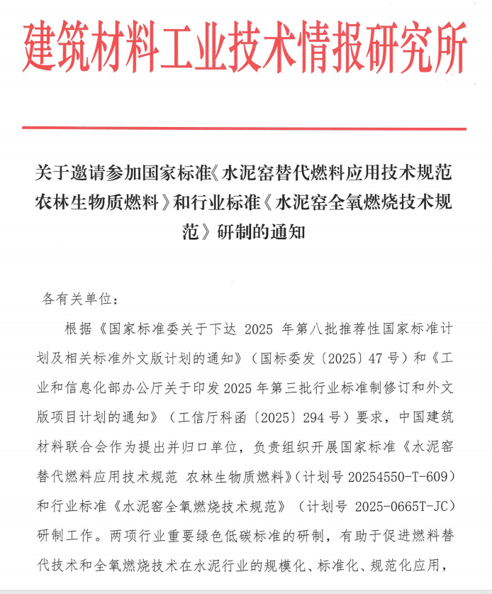 國標《水泥窯替代燃料應用技術規(guī)范農林生物質燃料》及行標《水泥窯全氧燃燒技術規(guī)范》參編邀請